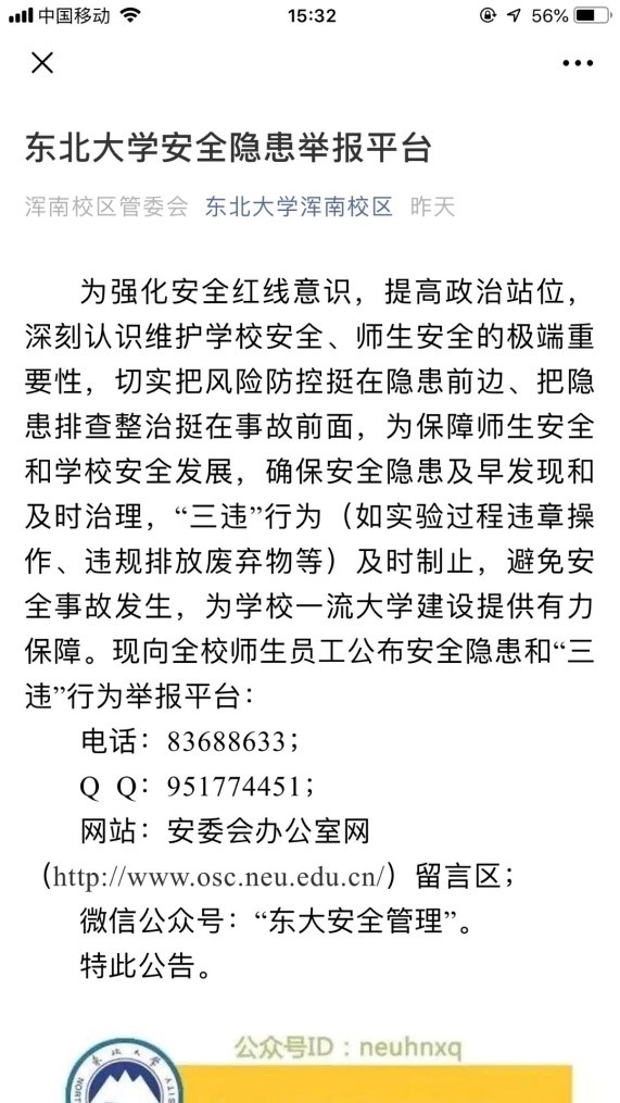 6月5日,完成两项工作:第一,通过浑南校区微信公众号和宿舍广告信息机宣传《东北大学安全隐患举报平台》;第二,在一号教学馆北出口摆放安全宣传展架。宣传《电气火灾预控知识》和《中华人民共和国安全生产法》。