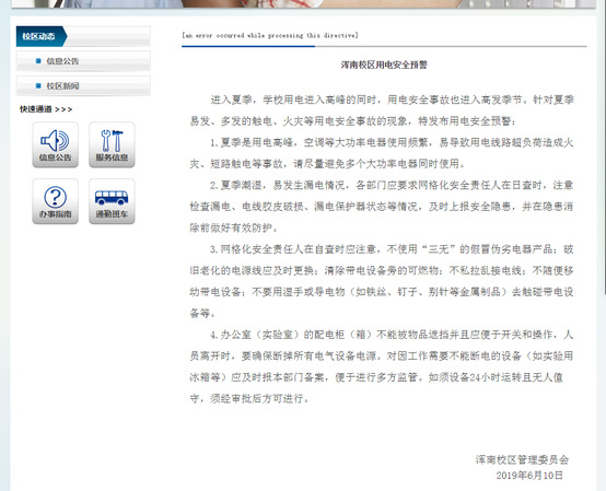 6月11日,通过浑南校区微信公众号、网站和学生宿舍广告信息机发布《浑南校区用电安全预警》。