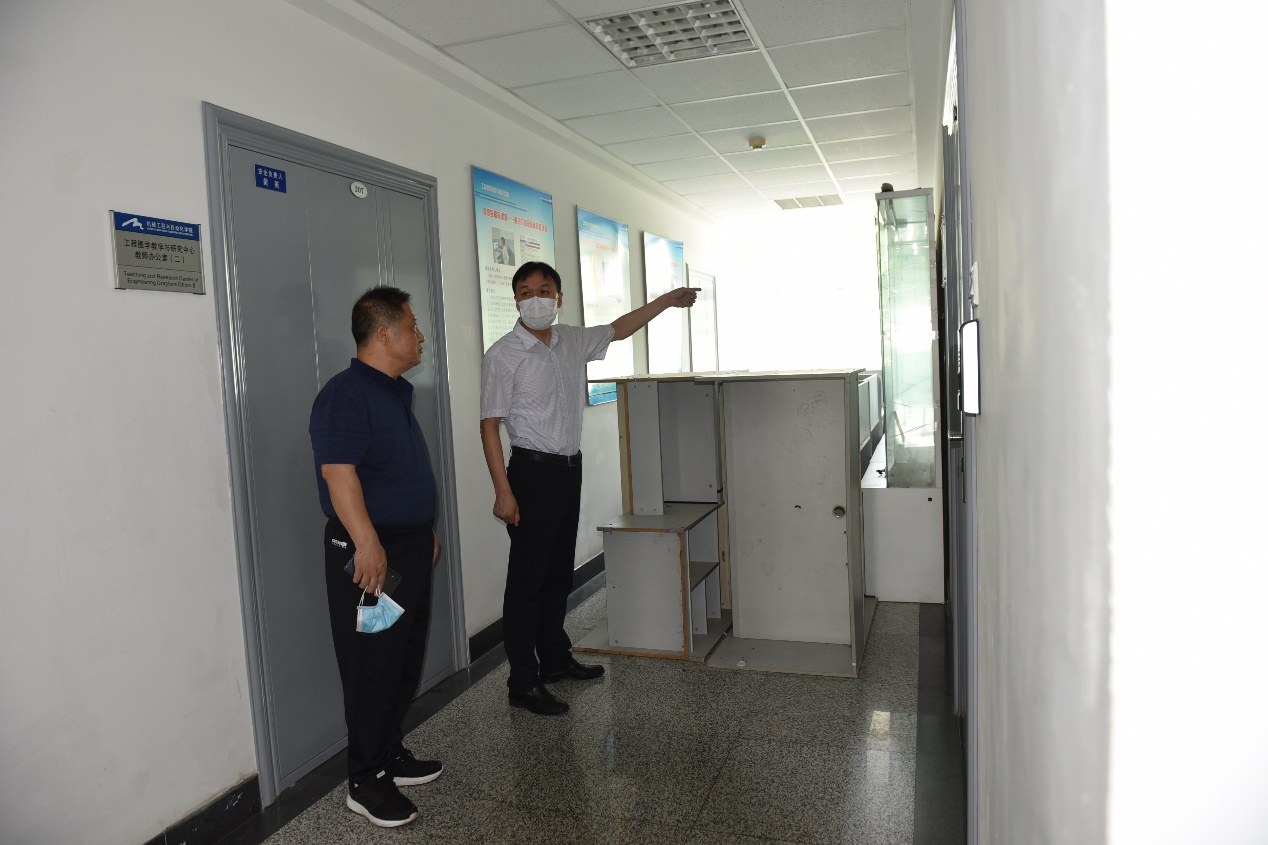 为了进一步巩固学院安全中期考核成果,落实学校实验室安全自查自纠工作,排查学院实验室和公共区域的安全隐患,7月15日上午,学院党委书记刘建军、院长于天彪、副院长田畅和办公室工作人员对学院新机械楼和实验室进行了安全检查。