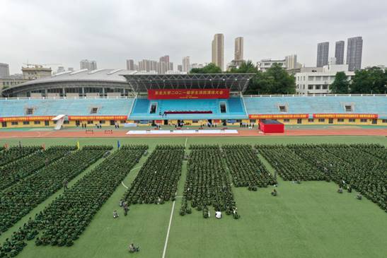 9月13日上午,东北大学2021级学生消防演练大会在南湖校区五四体育场举行。沈阳市消防救援支队指挥长张延明、和平区救援大队大队长孙海波、南湖派出所副所长杜洋、2021级军训团团长李兆武、副团长张腾飞,东北大学副校长孙雷以及相关部门负责人出席大会。