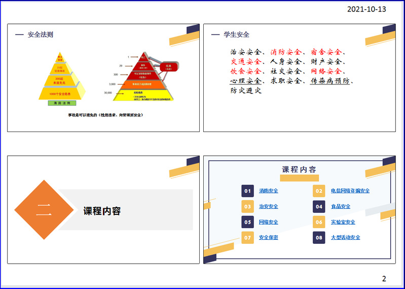 2021年10月11日起,学生通识安全教育正式进入课堂。学生通识安全教育依托《大学生心理与健康(二)》课程,面向本科一年级全体学生讲授通识性安全知识与技能,是落实学校一级安全教育的具体体现,是学校安全文化建设的重要举措。