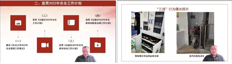 会上,副社长向阳解读了《东北大学2022年安全管理工作要点》并结合出版社工作实际,详细宣贯《出版社2022年安全工作计划》《出版社2022年安全教育培训工作计划》《出版社2022年安全检查和隐患治理工作计划》等安全工作文件内容;其次,以东北大学“三违”行为曝光台近期通报内容对员工进行安全教育培训,布置了三级安全教育培训内容;最后,强调在封校期间,员工要做到每日填写外出行程轨迹信息表、认真排查流调信息、每日上报健康信息、按照要求统一做核酸检测、非必要不网购、保持通讯工具24小时畅通等安全工作要求。
