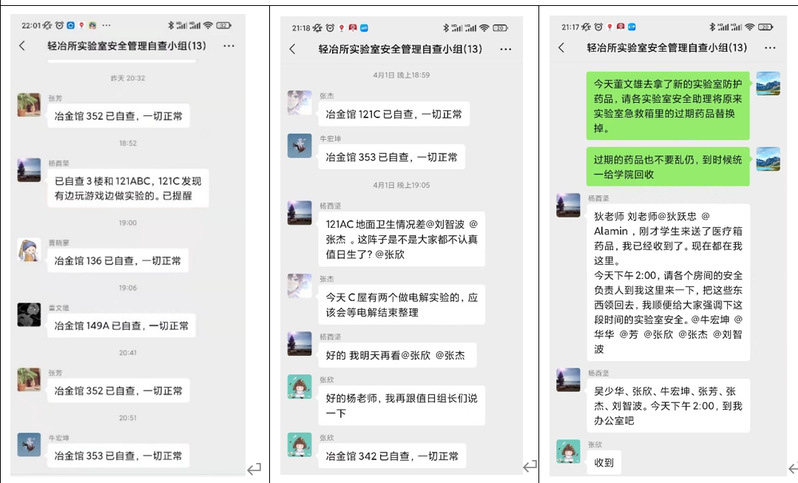 学院办公室、教学科研办公室留校教工林海洋、葛启桢、刘宏懿按时汇总实验室巡查小组日报,及时处理特殊问题和突发情况。每天晚上对冶金馆、钢铁楼、稀冶楼、知行楼等所有房间进行巡查,强化安全保障,确保疫情防控期间学院的实验室、学生自习室安全。