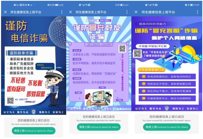 总结学生受骗较多的诈骗手段,推出防骗反诈系列海报,利用学校健康信息上报界面,对师生进行宣传教育。此项工作正在进行中。