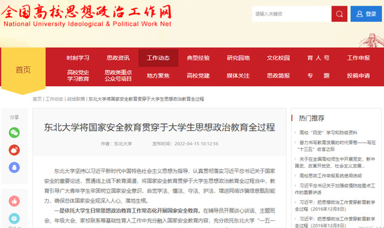 东北大学坚持以习近平新时代中国特色社会主义思想为指导,认真贯彻落实习近平总书记关于国家安全的重要论述,贯通线上线下教育渠道,将国家安全教育贯穿于大学生思想政治教育全过程当中,教育引导广大青年学生牢固树立国家安全意识,自觉学法、懂法、守法、护法,增进网络诈骗信息甄别能力,确保总体国家安全观深入人心、落地生根。