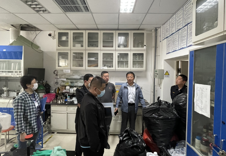 2023年5月16日上午沈阳市生态环境局和平分局杨礼军等一行4人来我校对实验室危险废弃物管理工作进行检查。