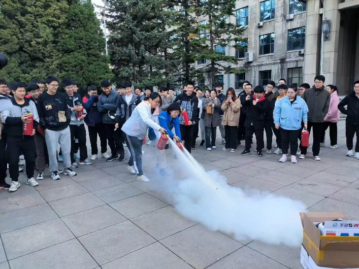 培训结束后,学院开展了应急疏散演练。随着消防报警器响起,信息学馆内的全体师生在工作人员的引导下有序撤离至安全地带,应急疏散演练圆满完成。随后在信息学馆北广场进行了灭火演习,在培训人员的指导下,师生参与现场演练,掌握了灭火器使用方法,成功扑灭了初起火情。