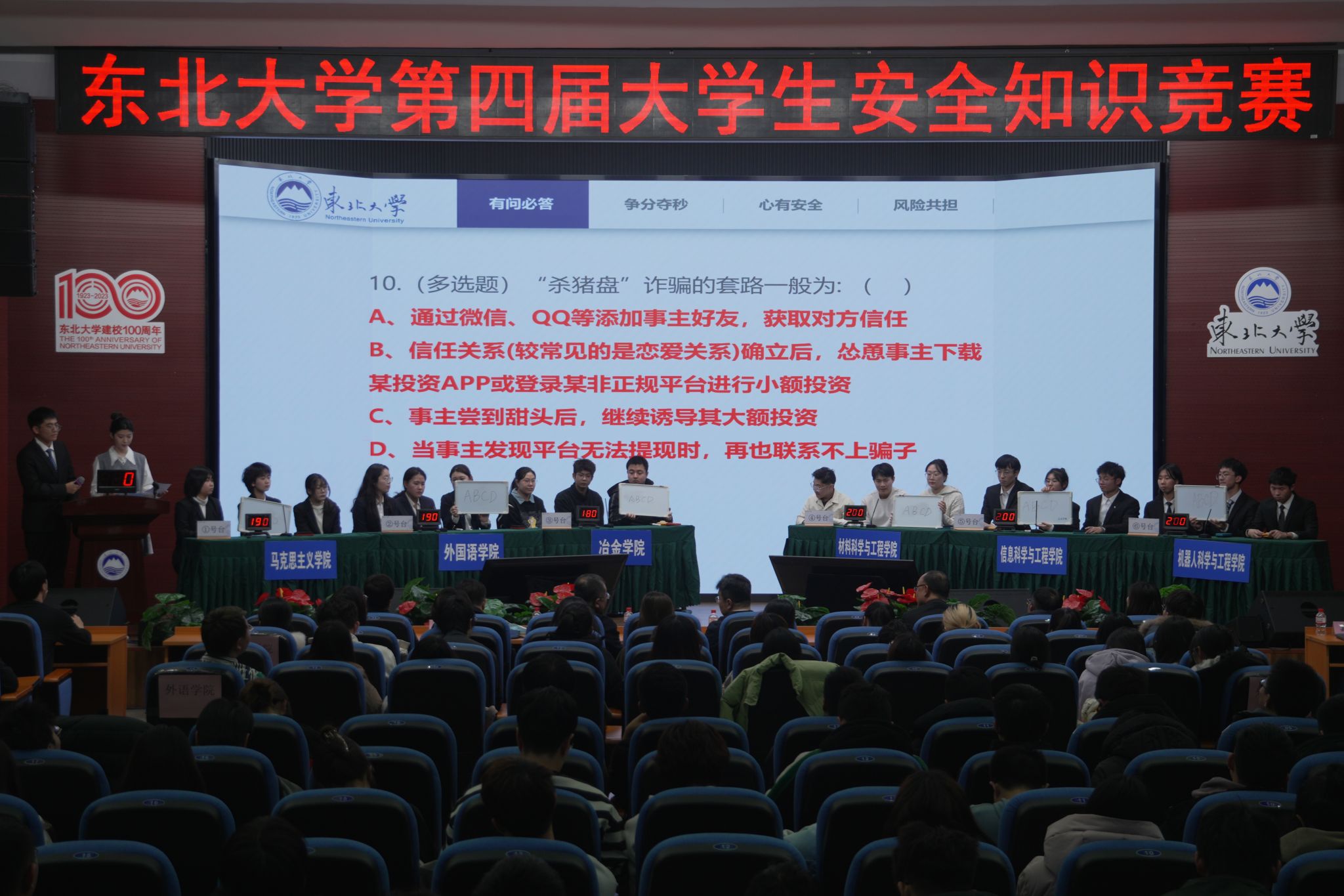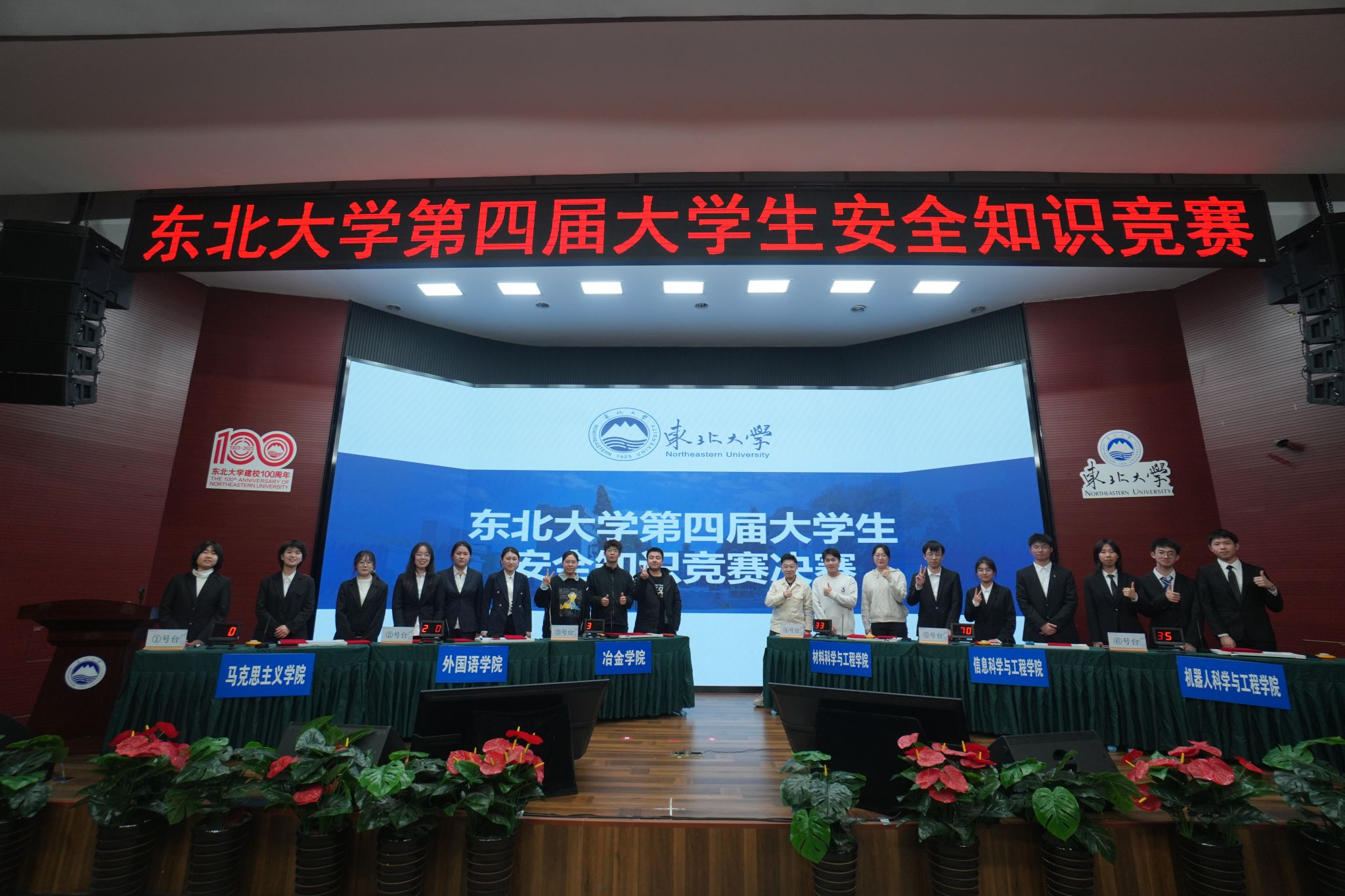 本次知识竞赛主题为“百年风华谱新篇,安全同行护发展”,由东北大学公安处、校团委、安委会办公室联合举办,分为选拔晋级赛和决赛两个部分,历时10天。经过选拔晋级赛的角逐,最终马克思主义学院、外国语学院、冶金学院、材料科学与工程学院、信息科学与工程学院、机器人科学与工程学院晋级决赛。决赛每支队伍派出3名队员参赛,经过风采展示、有问必答、争分夺秒、心有安全、风险共担等五轮比拼,最终信息科学与工程学院代表队获得一等奖,材料科学与工程学院和机器人科学与工程学院代表队获得二等奖,马克思主义学院、外国语学院和冶金学院代表队获得三等奖。公安处、研究生院、学生工作处相关负责人为获奖选手颁奖。