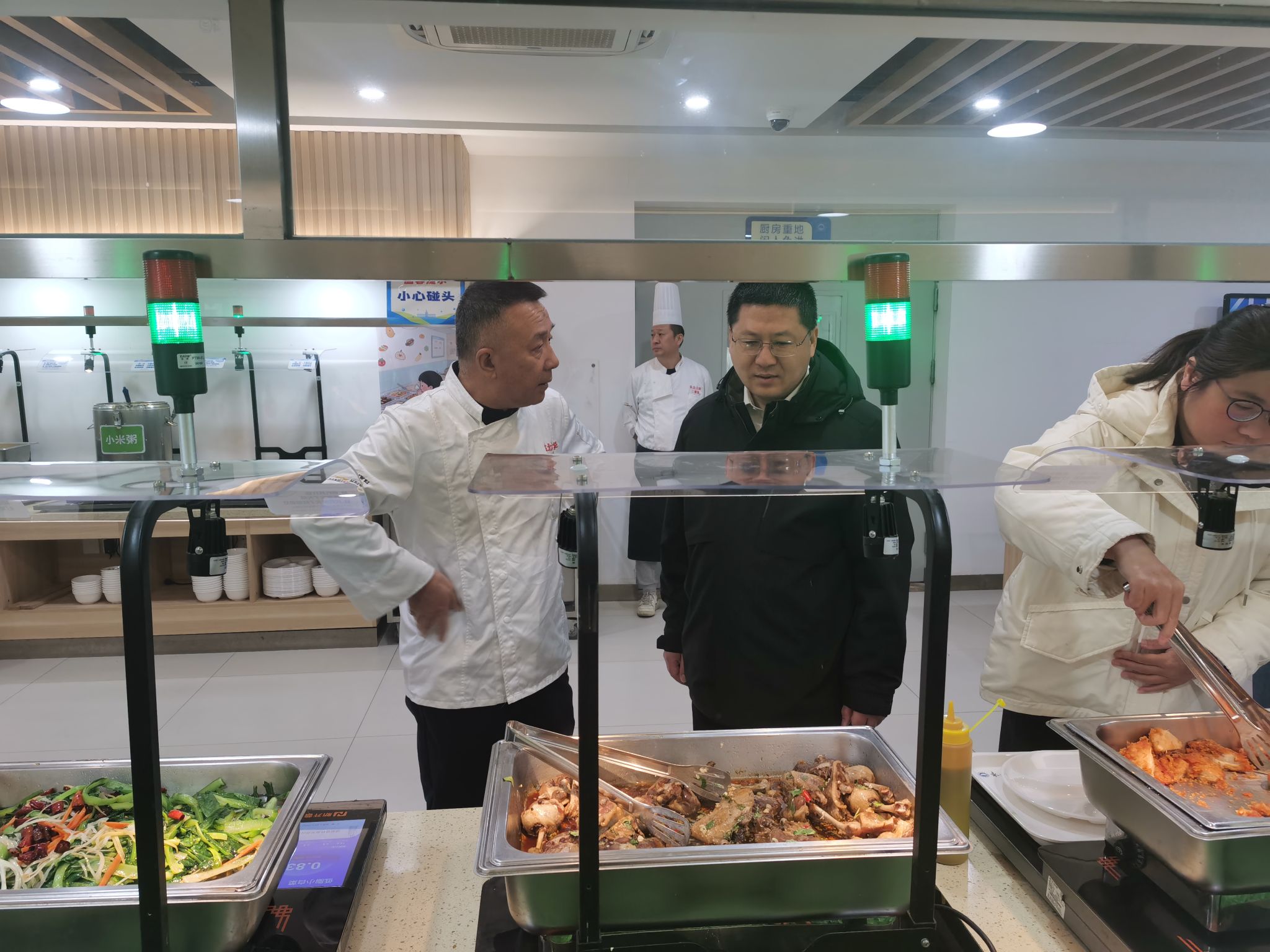 在学生第一食堂,郭海详细了解菜品营养搭配、定价标准、卫生清洁及学生用餐体验等情况。郭海强调,要牢牢守住校园食品安全底线,以营养为核心优化菜品供给,以惠民为原则严控餐饮价格,切实保障学生吃得安全、吃得营养、吃得实惠,让校园餐饮服务更有温度、更贴民心。